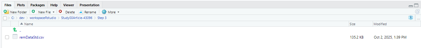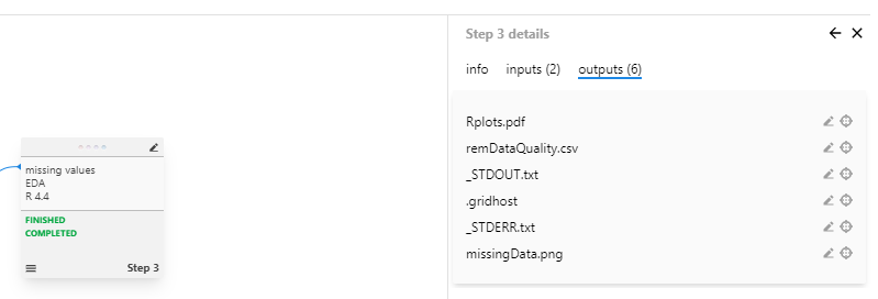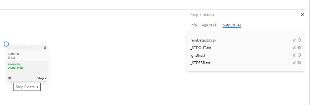 Figure 3: View Step 2 details showing available outputs including remDataStd.csv