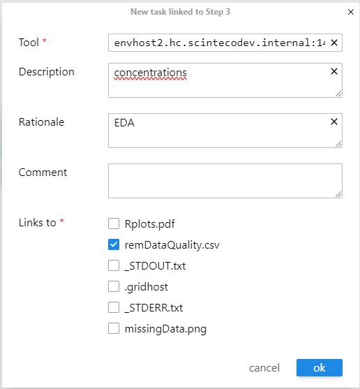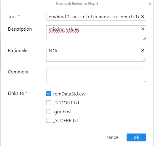 Figure 6: Configure the consumer step with dataset assignment, tool specification (Rscript), description, and rationale